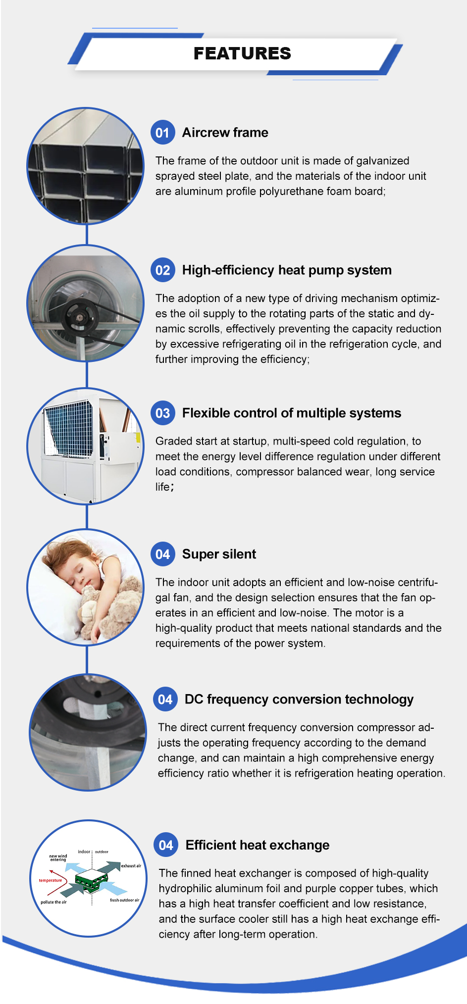 The frame of the outdoor unit is made of galvanized sprayed steel plate, and the materials of the indoor unit are aluminum profile polyurethane foam board;