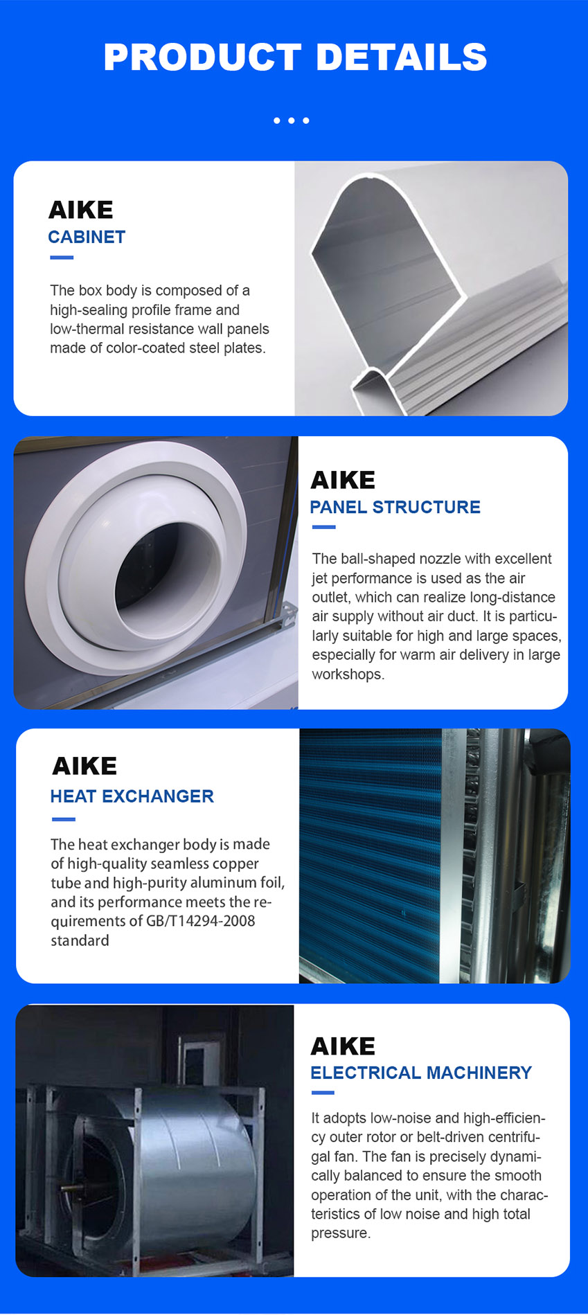 The ball-shaped nozzle with excellent jet performance is used as the air outlet, which can realize long-distance air supply without air duct. It is particularly suitable for high and large spaces,especially for warm air delivery in large workshops.